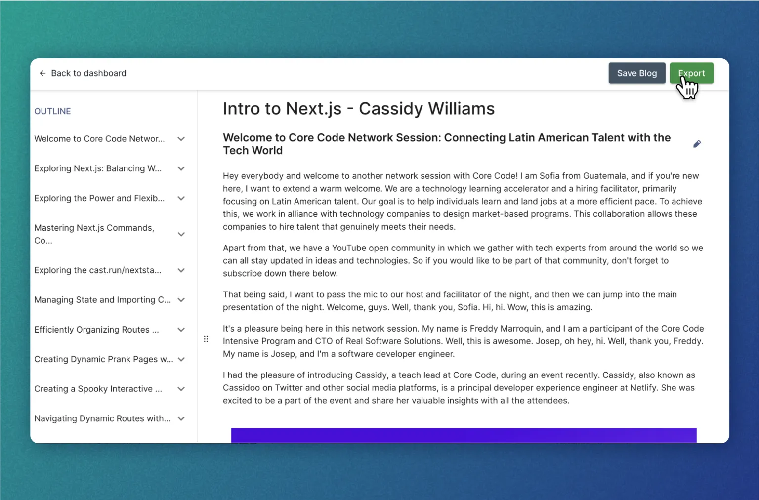 Developer advocates are the bridge between software companies and their developer users, often creating content to help educate and raise awareness in the community about particular features. Contenda makes it possible to take, for example, a video tutorial and turning it into a blog. This saves time and can even make it easier for a cross-functional team to collaborate.